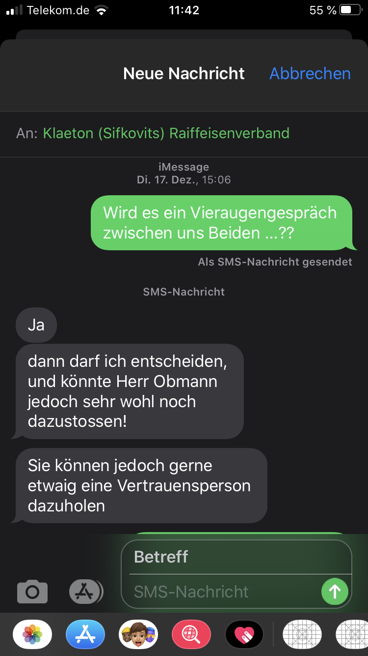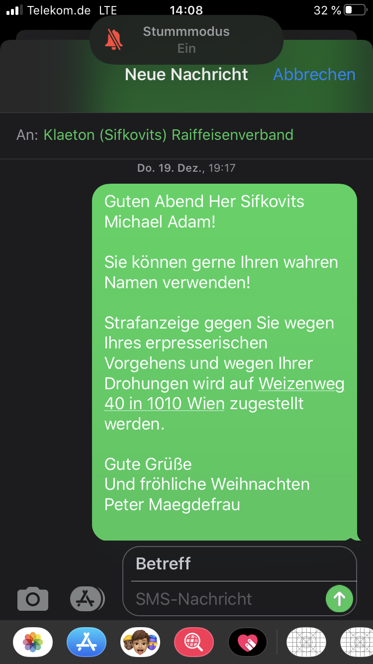 Im Auftrag des Vorstandsvorsitzenden von Raiffeisen meldete sich ein Herr Klaeton, den ich am 17.12.2019 im Salzburger Hotel Brandstätter traf. Dieser dubiose Herr heißt in Wahrheit Sifkovits Michael Adam. Zur Begrüßung machte er zuerst ein Foto von mir, um anschließend durch Drohgebärden mit dem Grundtenor „Ich solle doch meine Aktivitäten gegen Raiffeisen lassen“ das Gespräch zu beginnen. Dieses Gespräch beendete ich nach gut zehn Minuten. Meine Recherchen am nächsten Tag ergaben, dass dieser Herr Klaeton in Wahrheit Sifkovits Michael Adam heißt (www.govsolag.com, Weizenweg 40 / A-1010 Wien, +43 664 9161477). Wie kriminell muss man sein, wenn man zu solch dubiosen und hinterlistigen Methoden greifen muss?